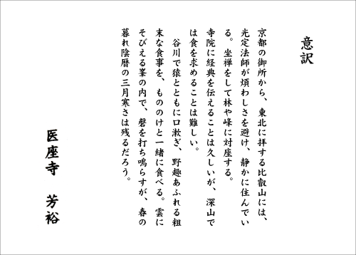 光定の残した文書の中に、最澄の言葉として「怨みを以て怨みに報ゆれば怨み止まず、徳を以て怨みに報ゆれば怨みたちまち尽く」が挙げられる。千二百年の時を経て考えさせられる言葉であることと、愛媛県史随一に掲げねばならない「光定」の偉大な活躍が産土(うぶすな)の古里北条から忘れ去られていることを悲しく思う県民の一人である。没後千百五十年が近い。